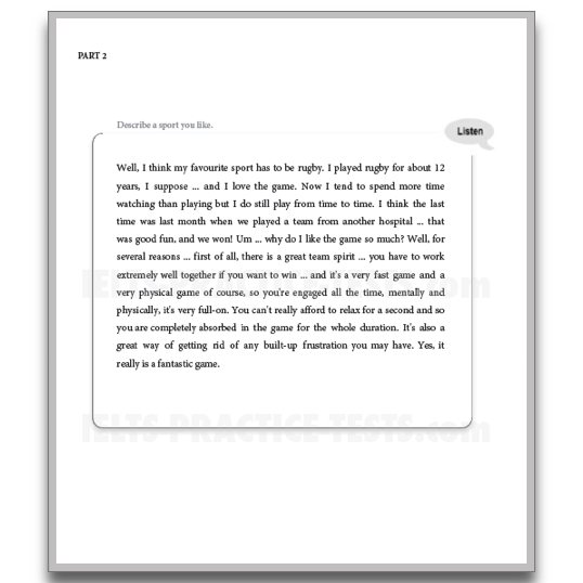 All the IELTS Speaking question types are included. Each test contains: three or four Part 1 questions, a Part 2 individual long turn question and three or four Part 3 discussion questions.
